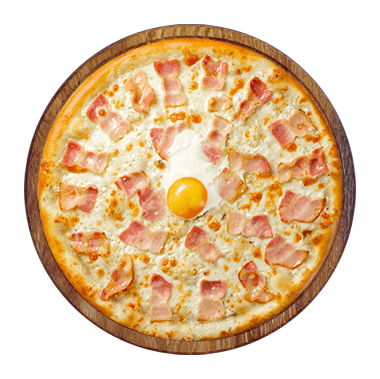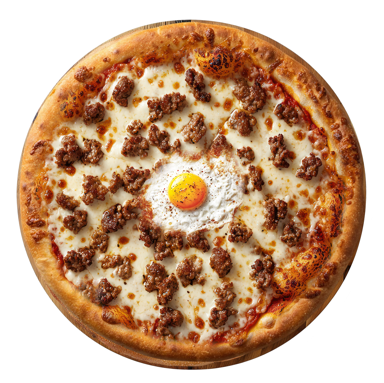 Crème fraîche, mozzarella, bacon, viande hachée, cheddar, oeuf.