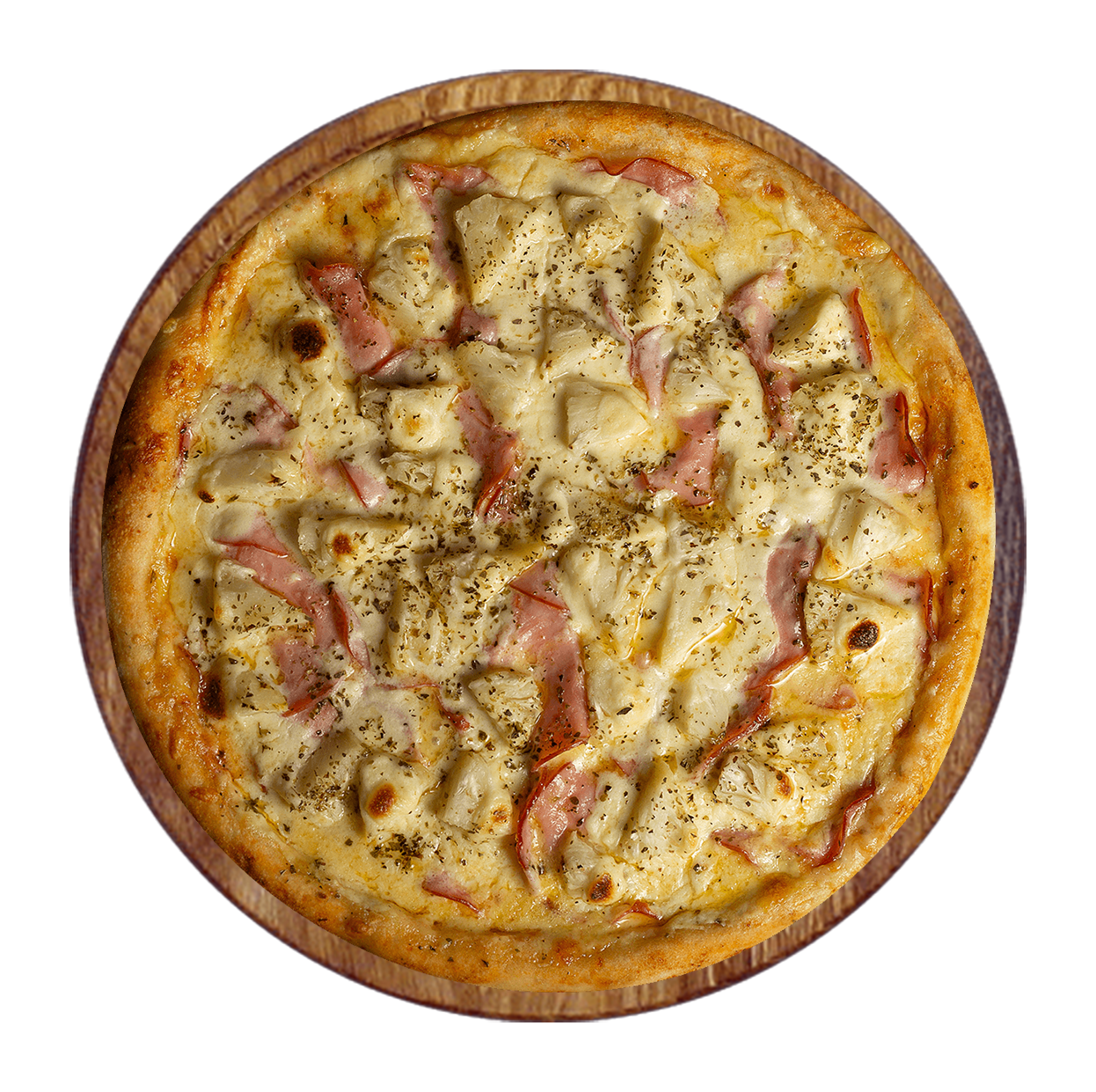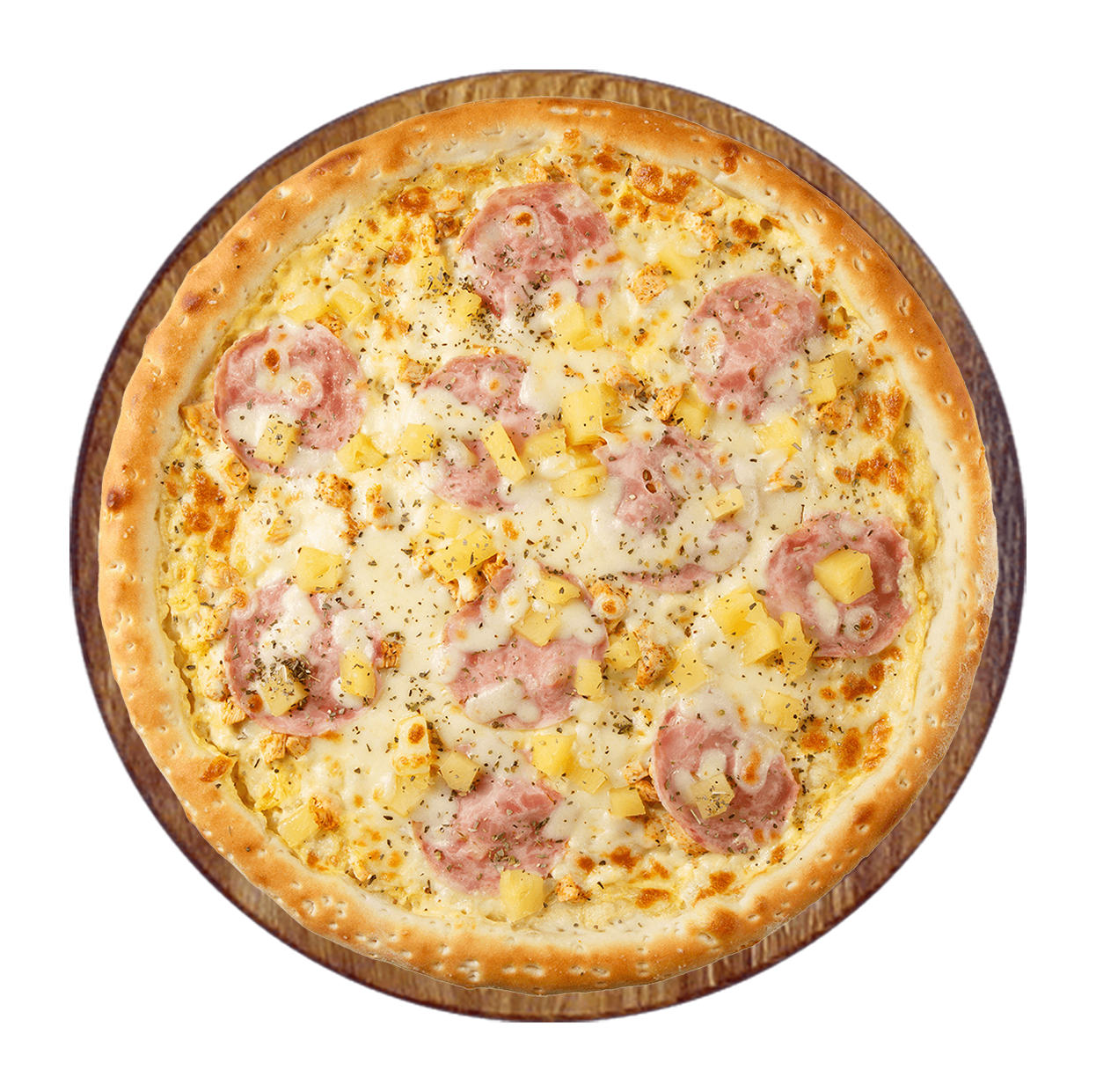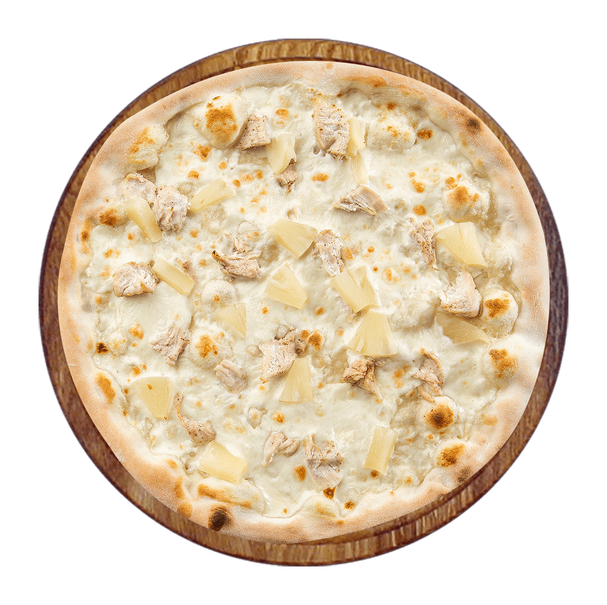 Crème fraîche, mozzarella, jambon, émincé de poulet, champignons.