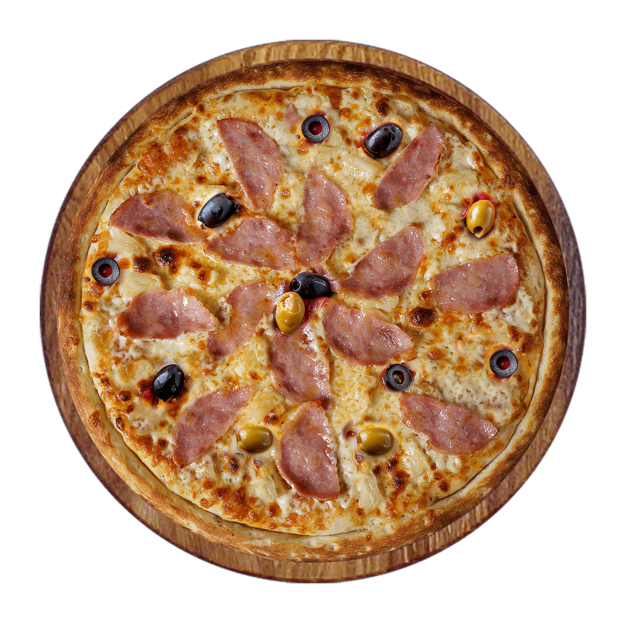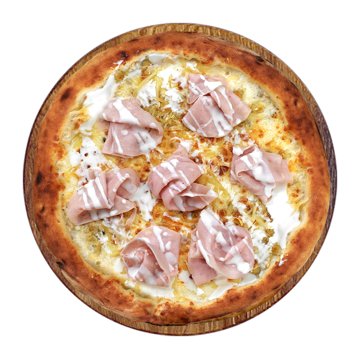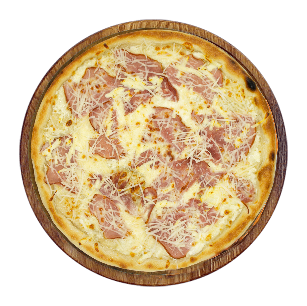 Crème fraîche, mozzarella, jambon, oignons, tomates fraîches, olives.