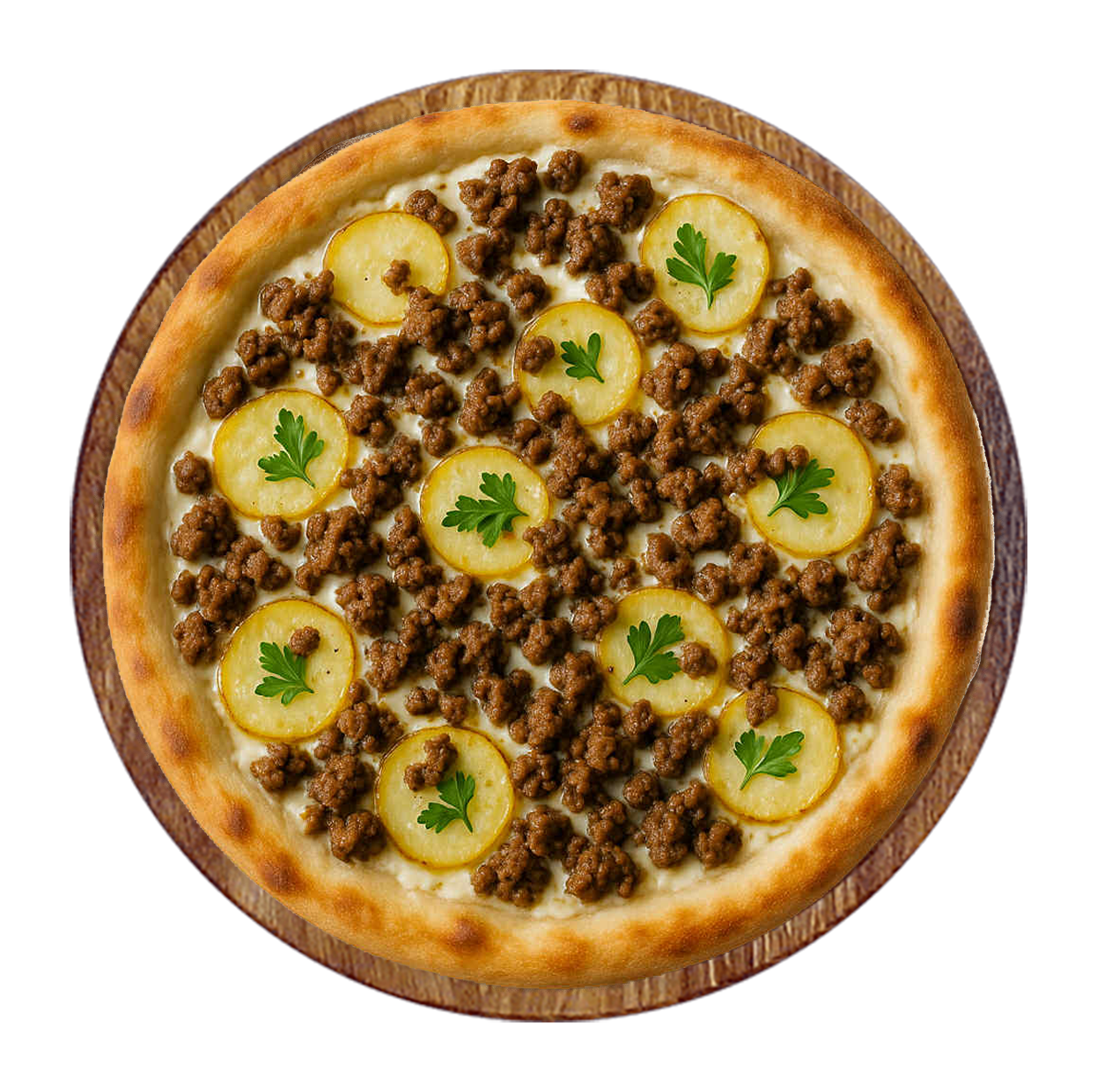 Crème fraîche, mozzarella, viande hachée, pommes de terre, olives.