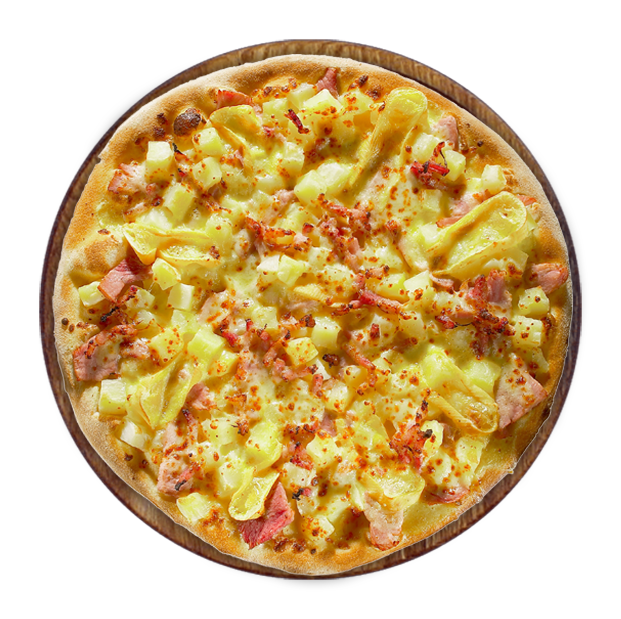 Crème fraîche, mozzarella, poulet fumé, pommes de terre.