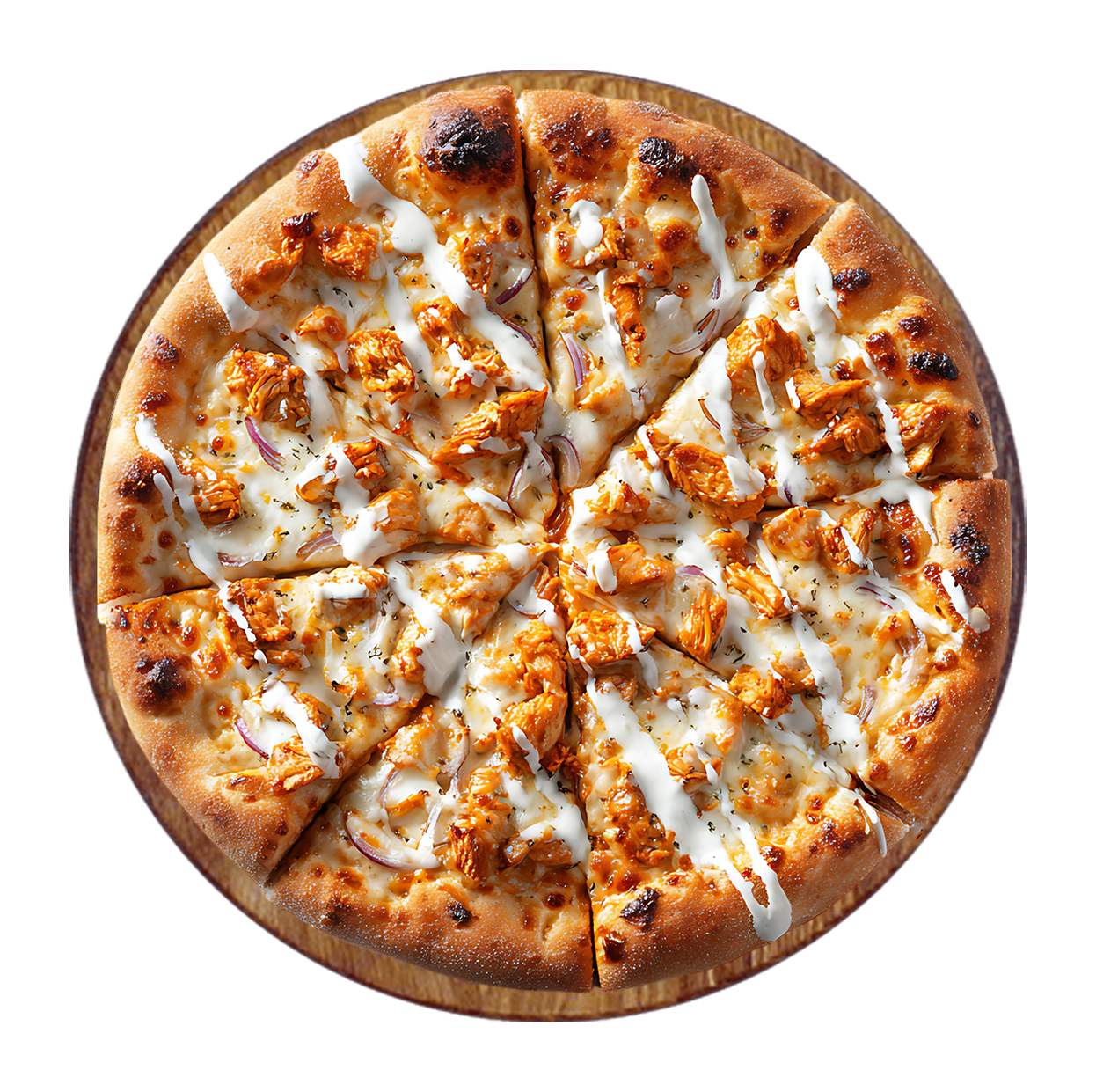 Crème fraîche, mozzarella, poulet fumé, émincé de poulet, poivrons.