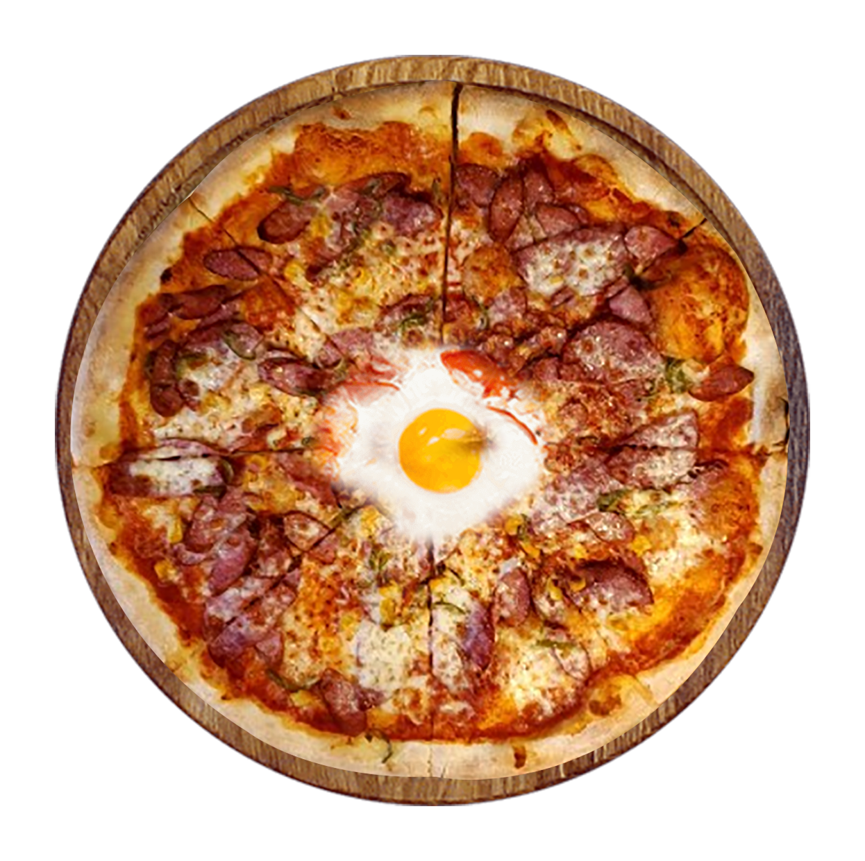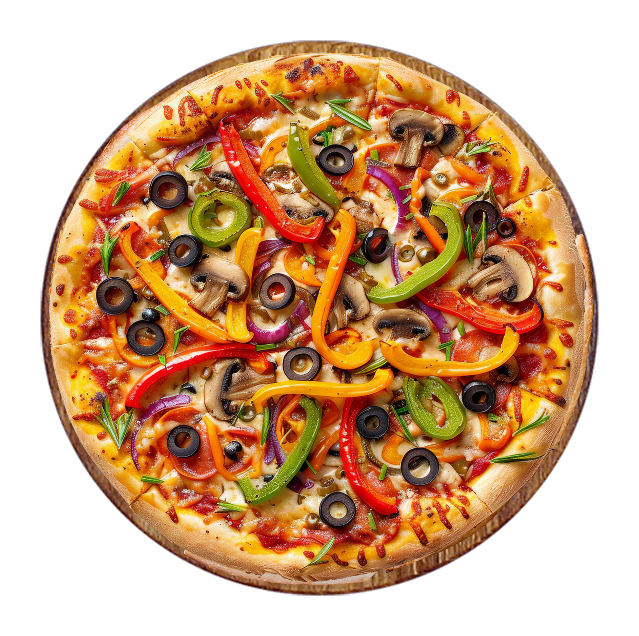 Tomate, mozzarella, pepperoni, merguez, poivrons, olives.