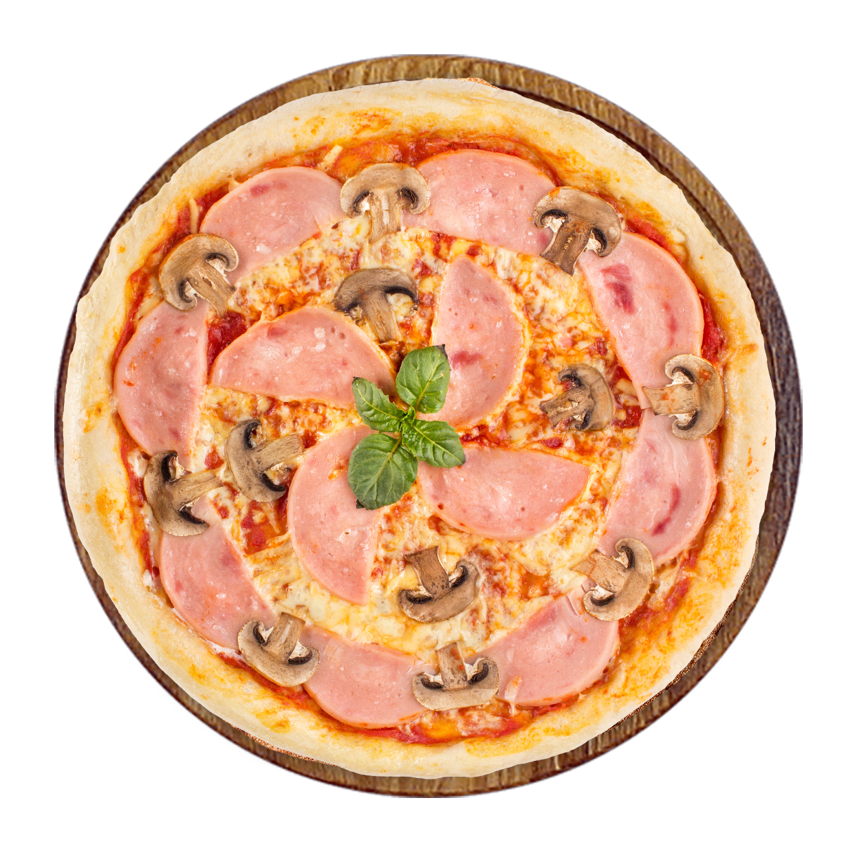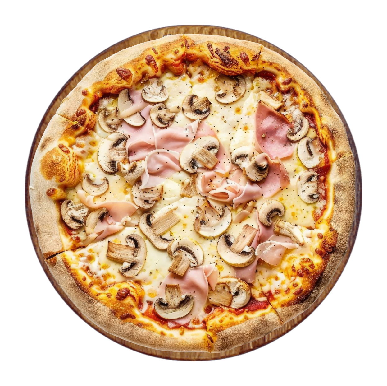 Tomate, mozzarella, jambon, champignons.