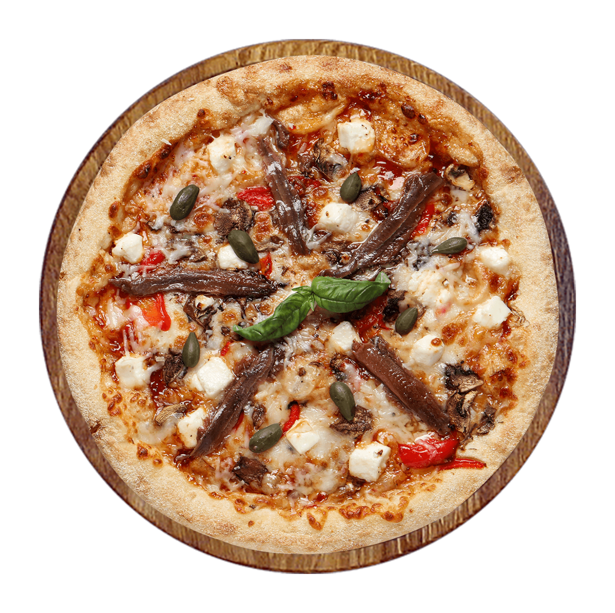 Tomate, mozzarella, câpres, anchois, olives.