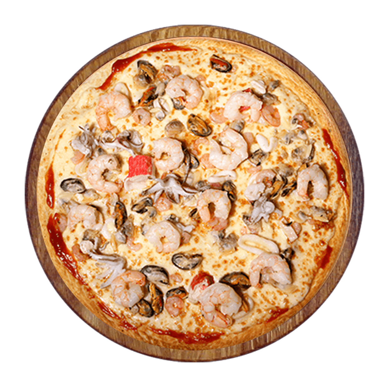 Tomate, mozzarella, cocktail de fruits de mer, persil, ail.
