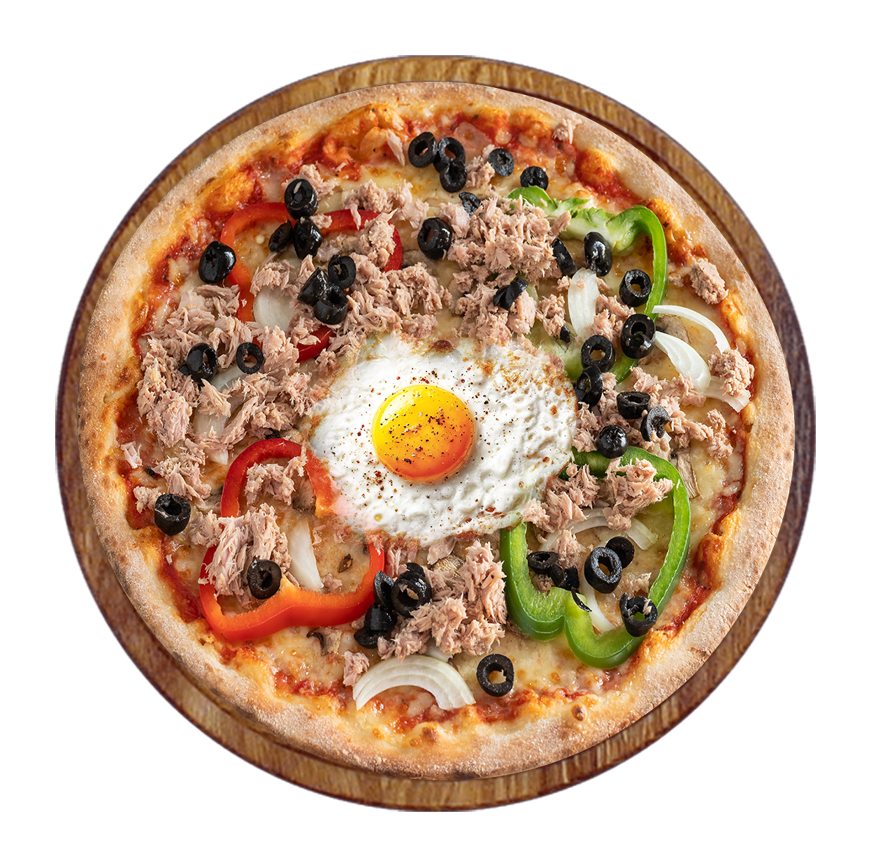 Tomate, mozzarella, thon, olives, oeuf.