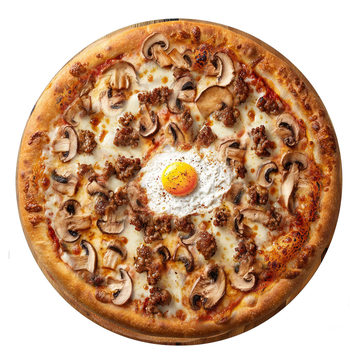 Tomate, mozzarella, viande hachée, champignons, oeuf.